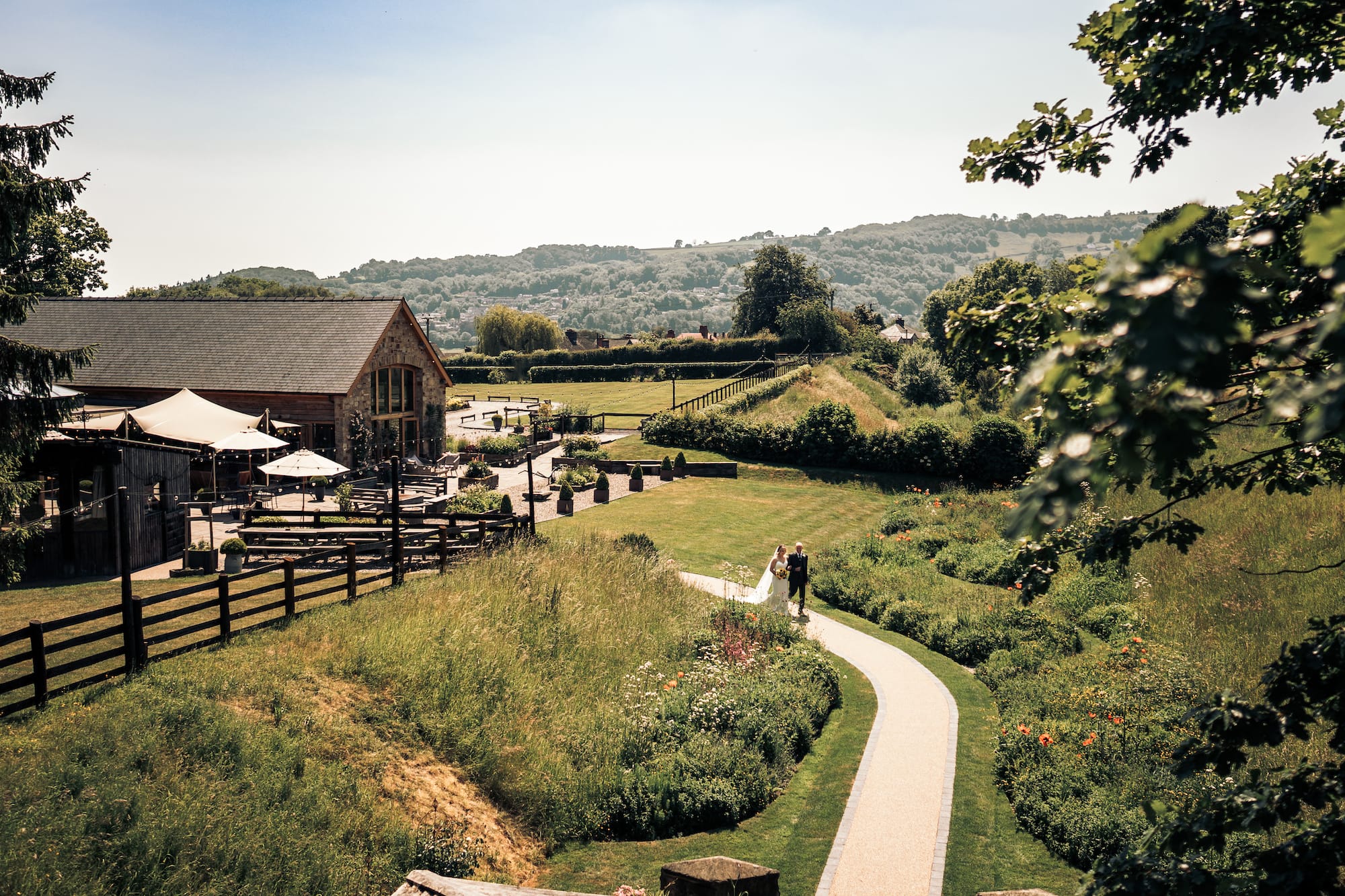 Newlywed couple stroll through a field overlooking Tower Hill Barns countryside wedding venue.